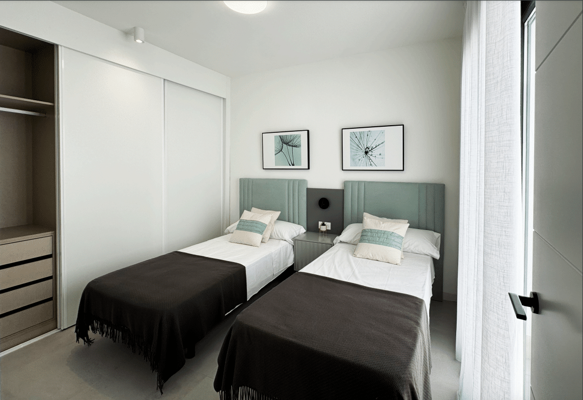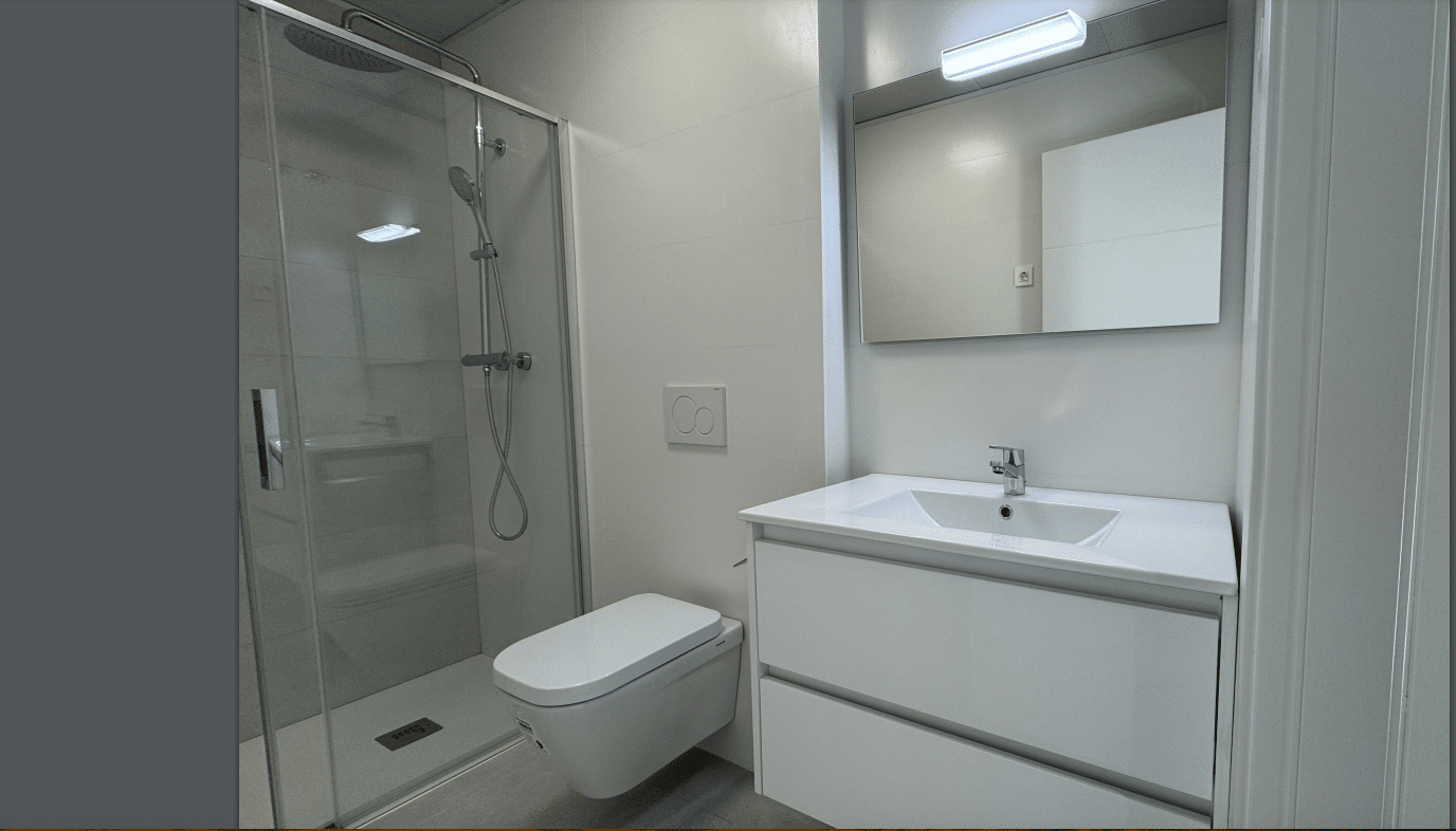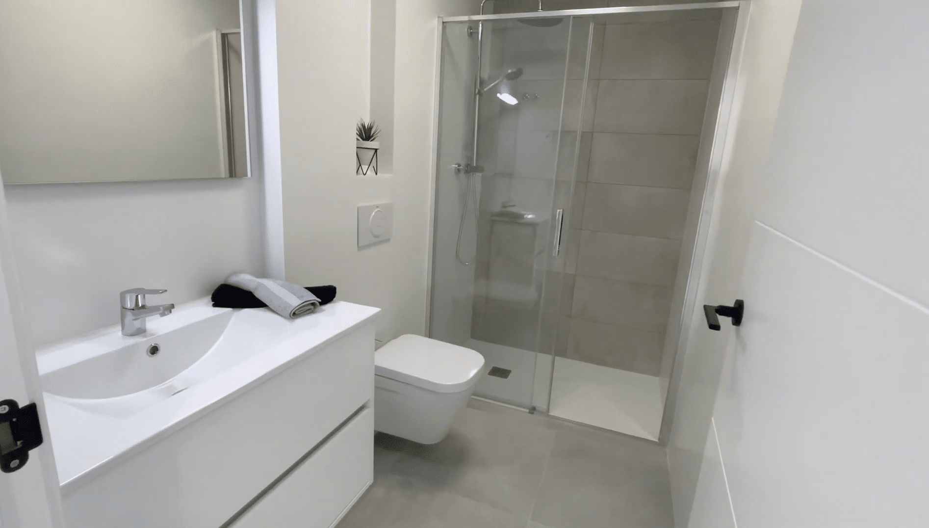 - Cuartos de baño completamente amueblados con: inodoro suspendido, tocador, espejo y columna de ducha de lluvia.