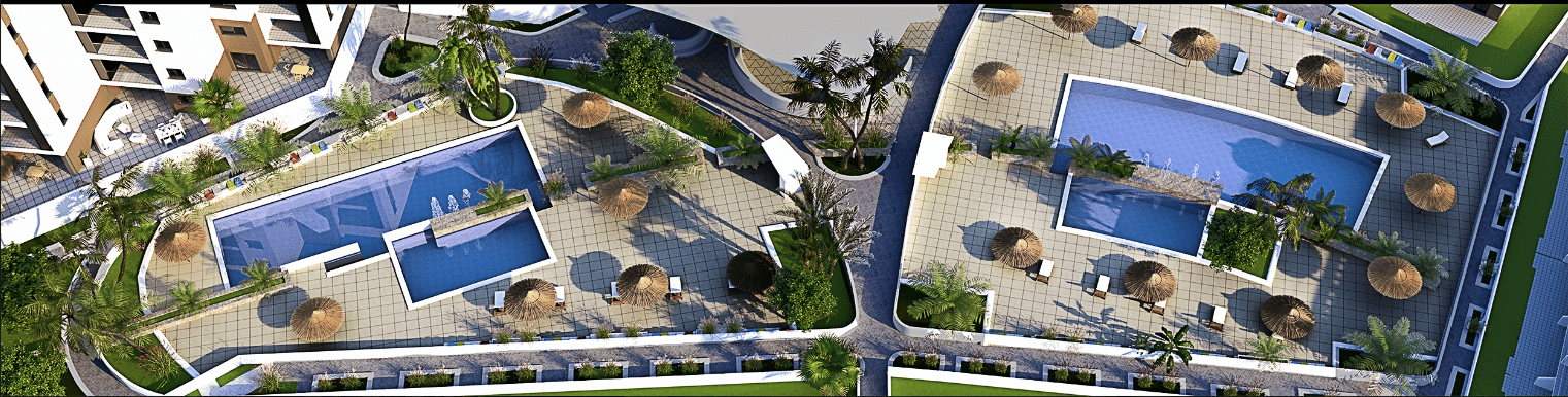 Un área central pensada para relajarse y socializar: varias piscinas, senderos ajardinados y aparcamiento tanto en superficie como en sótano. Todo, en un entorno cerrado y cuidado al detalle.