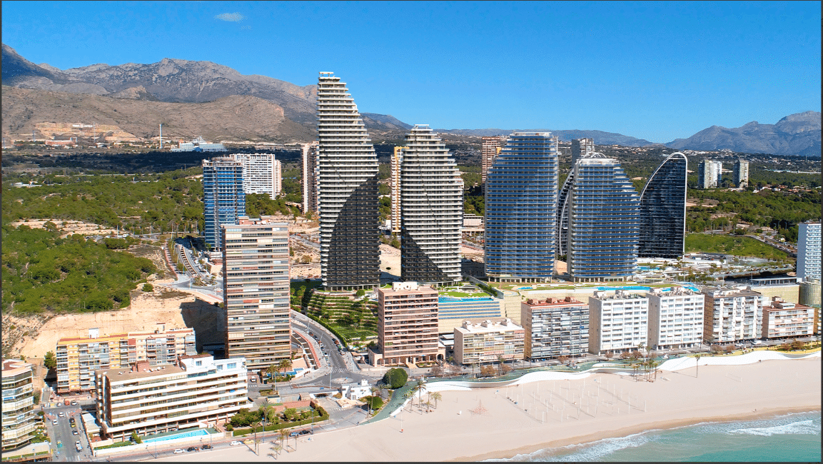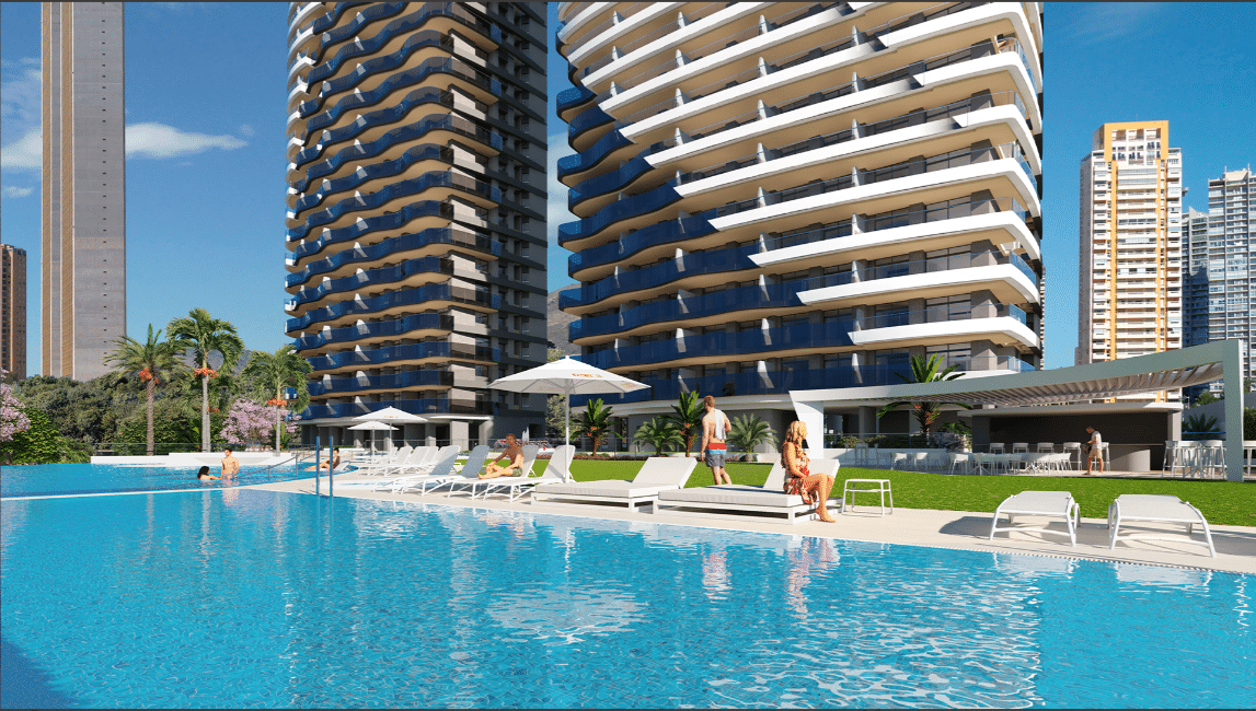 El residencial está formado por una torre de 30 plantas y otra torre de 40 plantas, ambas con orientación Sur. Las tipologías de viviendas son muy variadas, podrás elegir entre apartamentos Excellence de 1, 2 y 3 dormitorios con 1 o 2 baños y apartamentos Premium de 2, 3 y 4 dormitorios con 2 o 3 baños. Un diseño que busca el máximo confort, y que te permitirá disfrutar del Mediterráneo como nunca antes. Las terrazas (cubiertas y descubiertas) tendrán barandillas de vidrio que permiten dar continuidad a las vistas y disfrutar de ellas desde el interior. Sunset Sailors by TM está llamado a convertirse en un icono del skyline de Benidorm, un referente en la playa de Poniente